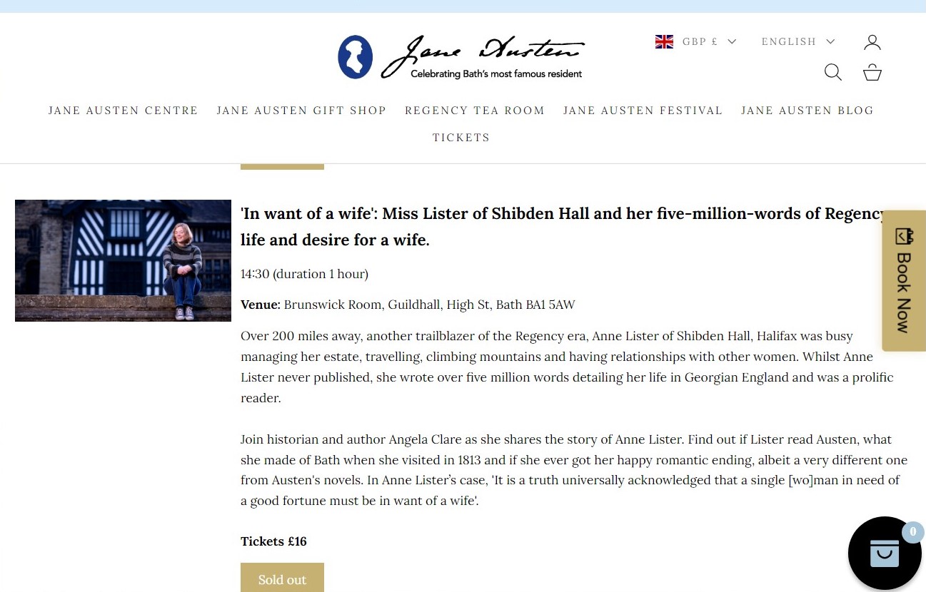 Jane Austen Fesival, Bath, September 2025 'In Want of a wife'- a sold out talk as part of the Festival about Anne Lister of Shibden Hall. |
